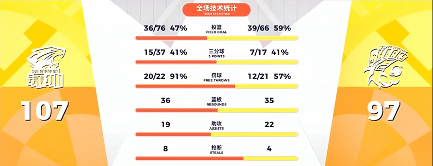最后关头,贺希宁的三分彻底终结比赛悬念,全场比分定格在97比107,上海男篮九连胜遭到终结。